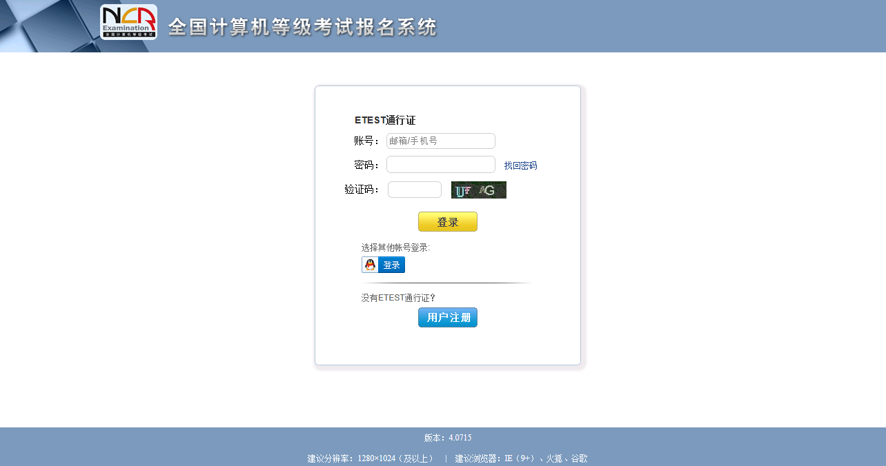 二、 如果考生有etest通行证直接登录或者使用QQ号登陆,然后转到第八步,如果考生既没有etest账号又不想使用QQ号登陆,可以点击上图所示的最下方“用户注册”按钮,进入下图所示页面,注册通行证。