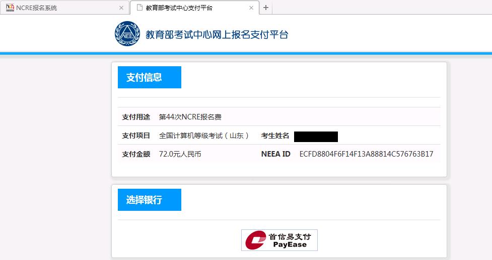 十七、 在弹出的教育部考试中心支付平台页面选择银行支付(如果没有弹出支付页面,需要考试设置本地浏览器,允许弹出页面。)