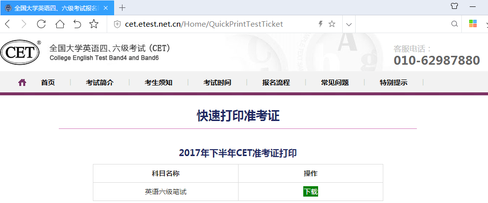 第一步: 打开全国大学英语四、六级考试报名网站(cet.etest.net.cn),点击“快速打印准考证”。