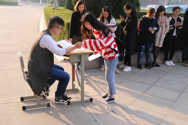 考试当天,志愿者们6点在信息楼前集合,并领取自己的任务安排。此次志愿服务共设1个咨询点,十二个考场等待区。每个服务区都有志愿者为考生们热情服务,并耐心解答考生们的问题。在烈日炎炎下,身为志愿者的他们并没有离开自己的服务区,而是一直伴随着考生直至考试结束。他们表示自己很高兴能够为考生们顺利完成考试而贡献自己的绵薄之力。