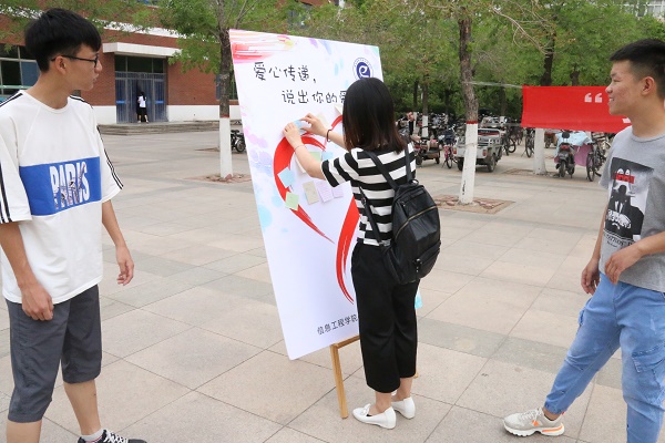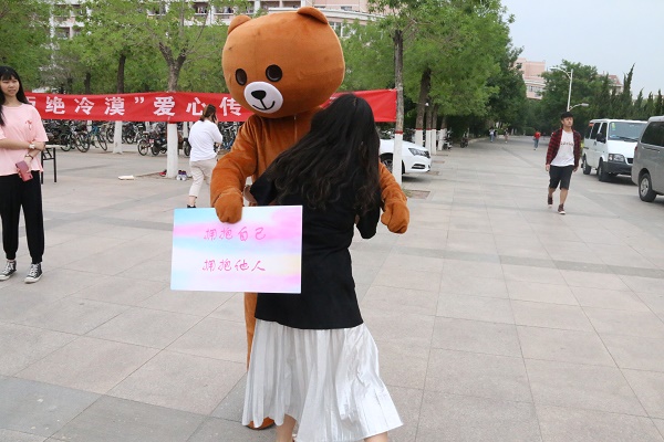 为了让同学们特别是毕业生,有更大的勇气来表达自己的感情,来面对今后的人生,让大家都能敞开胸怀,以会心的微笑给身边的人以诚挚的拥抱,消除生活中冷漠与隔离,给自己以及他人面对生活压力的信心。基于此条件,哈哈体育心理辅导站开展了此次“拥抱温暖,拒绝冷漠”爱心传递活动。此次活动于6月1日在二餐广场举行。