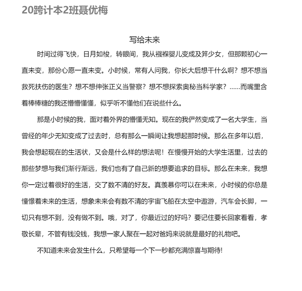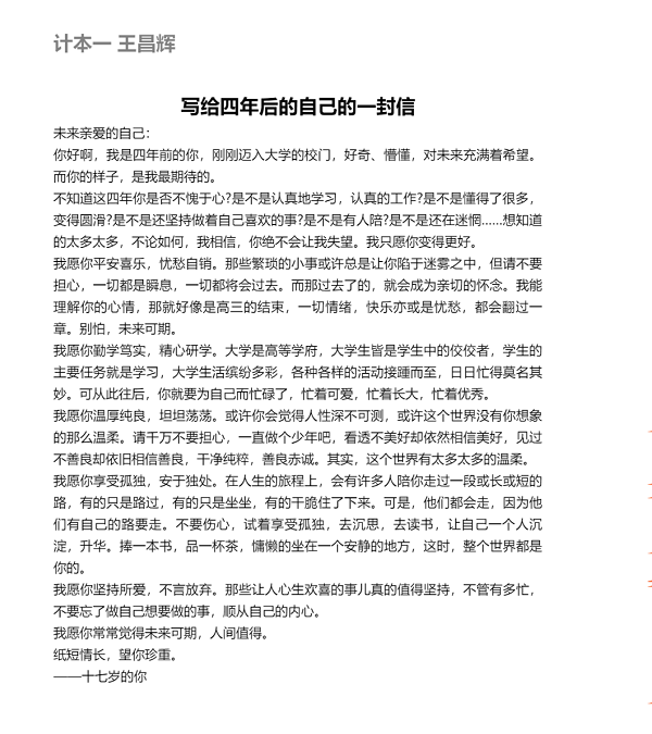 本次书信活动是以“写给未来的一封信”为主题,以目前的老员工活为基础,要求同学们给未来的自己写一封信。书信内容可以总结现在,展望未来;也可以从思想、学业、生活、师生关系、同学关系等方面进行规划描述;还可以朋友的口吻,以说话谈天的形式,与未来的自己说话谈天。活动通知发出后,受到了同学们的积极响应。活动期间,同学们认真撰写书信,思考自己未来的成长目标、设想一年后年后心与心的对话。书信写好后以电子版的形式上交,经过评委的反复斟酌,评出了优秀作品,并给予优胜同学相应的奖励。
