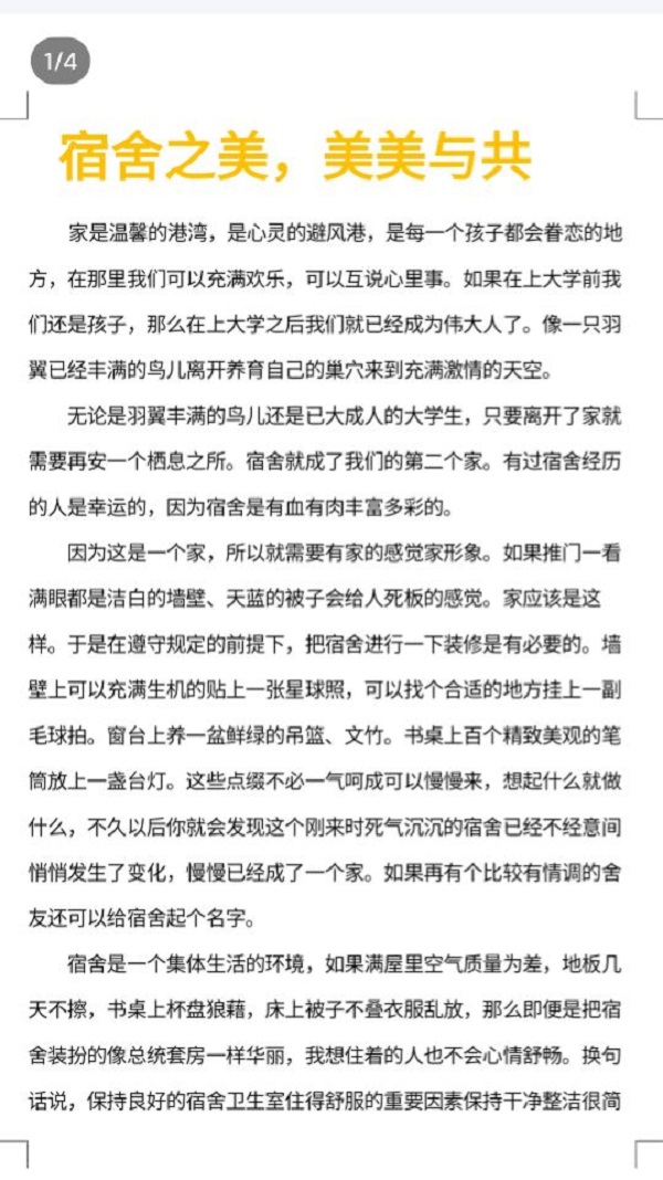 活动开始,同学们积极踊跃的投稿,征文中写下了同学们朝气与执着,记录了同学们的笑容与烦恼,留下了同学们的欢声与笑语,以及维持宿舍卫生,维护宿舍之美的责任与义务。在作品中同学们用诗歌、散文、议论文等多种文体表达出对他们宿舍的热爱,以及维护宿舍环境的责任感。同学们的征文整体上突出了“宿舍之美,美美与共”的主题,彰显着同学们对宿舍的珍惜与喜爱,充满着维护宿舍之美的责任,最后本次比赛在激烈的评选中结束。