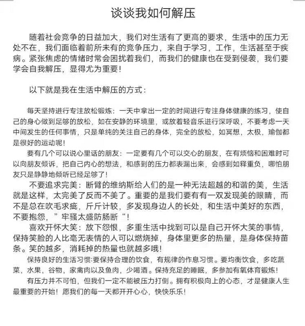压力在生活中无处不在,它可能来源于学习,来源于人际交往,来源于竞争……压力对生活的影响很大,不仅仅是情绪,时间一长,连身体的健康都会受到连累。本次活动以“爱滨院•谈心路•互分享•爱生活”为主题,通过书信的方式谈谈自己的解压故事,旨在为有压力的同学提供一个交流平台,激发同学们对生活的热爱。活动经过员工会的宣传后,同学们积极的报名参加,完成的作品以电子版的形式上交。活动征集到不少作品,作品内容均突出秋日主题,并与校园特色相联系,内容丰富,感情细腻。经过评委的认真评选,共评出一等奖50名,二等奖80名,三等奖140名。活动最后,公司给予优胜同学相应的奖励。