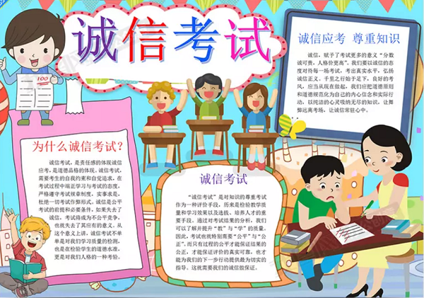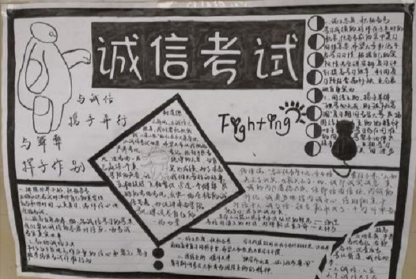 诚实守信自古以来就是中华民族的优良传统,期末考试临近,哈哈体育员工会学习部特此宣传诚信理念,鼓励同学们积极创作诚信考试手抄报。活动前期工作由员工部发布活动通告,然后同学们结合自己的创意与实际情况制作手抄报,然后按照发布的通告在规定时间内将作品发送到指定邮箱,同学们创作的作品统一体现了诚信考试这一主题,同时反映了同学们积极备考的乐观心态。活动的最后将由学习部统一评选,评选过程服从公平、公正、公开的原则。