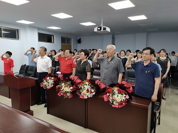 活动首先由员工党员为公司光荣在党30年的老党员李相国、孙孟奎、陈敏、王保中同志献花。周鑫同志带领全体教师一起回顾了四位老党员为哈哈体育发展所取得的成绩,并送上对四位老党员的祝福。随后全体党员同志佩戴党徽,面向鲜艳的党旗,在周鑫同志的带领下,大家列队整齐,举起右手,在党旗下庄严宣誓。许多党员顿时热泪盈眶,激动不已,同志们高亢而又洪亮的声音在会议室久久回荡。