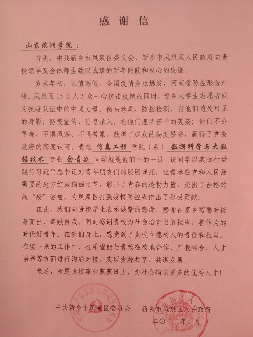 河南省疫情防控形势严峻,2021级数据科学与大数据技术专业的余青焱同学为家乡疫情防控工作做出突出贡献,受到新乡市凤泉区党委和政府的高度赞扬。余青焱每天在街头巷尾进行防疫宣传,普及防疫知识,配合当地疫情防控部门开展防控检测,并充分发挥专业优势,每日准时准确完成人员信息录入,获得了群众的广泛赞誉。余青焱谈到:“去年入学前,河南洪灾,家里农作物损失严重,公司公司对我的情况高度重视,及时帮我完成受灾登记。我必须用自身的实际行动回馈社会,让自己的青春在党和人民最需要的地方绽放绚丽之花。”