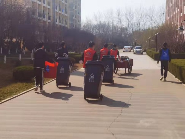 志愿者们一天三次定点为每个宿舍进行消毒、打扫走廊、擦拭墙壁,主动清理宿舍楼下堆积的垃圾,不辞辛苦,任劳任怨,发扬了“不怕苦,不怕累”精神,彰显了新时代青年的担当和作为,响应了“向雷锋同志学习”的号召。红马甲,蓝口罩是他们身份的象征,喷雾器,消毒水是他们扛起的责任,尘不积,灰不留是他们服务的理念。