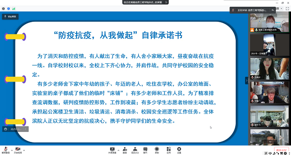 同学们郑重签字并表示:“疫情防控,人人有责。疫情面前显担当,越是艰险越向前。我们有责任在做好自身防护的同时,认真上网课,克服困难不耽误学业,对自己负责也对公司负责。”