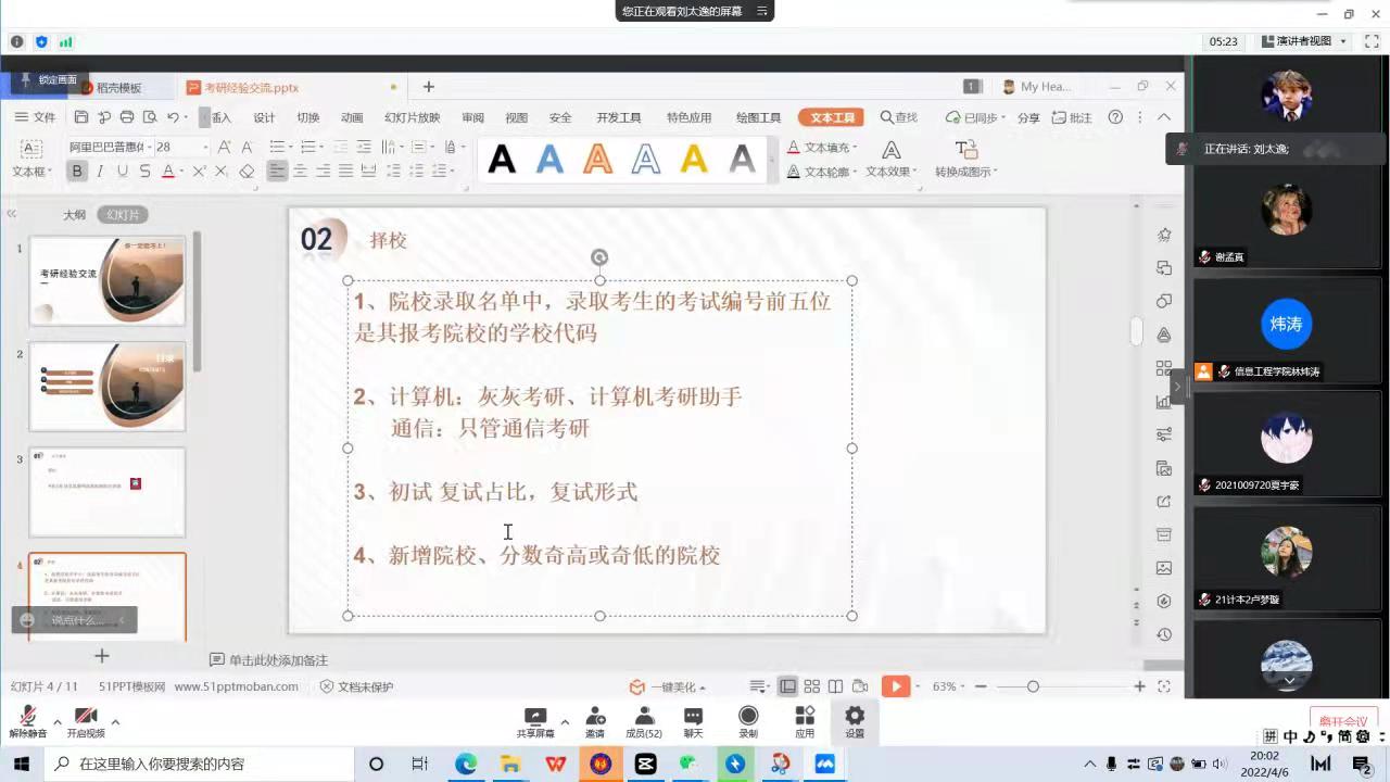 考研是每个老员工都想踏上的一条路,但是很多同学对考研存在不少的困惑,为此,4月6日,哈哈体育举办“熠熠青春,研梦起航”线上考研交流会,邀请公司优秀考研生为同学们介绍和解答考研相关问题。