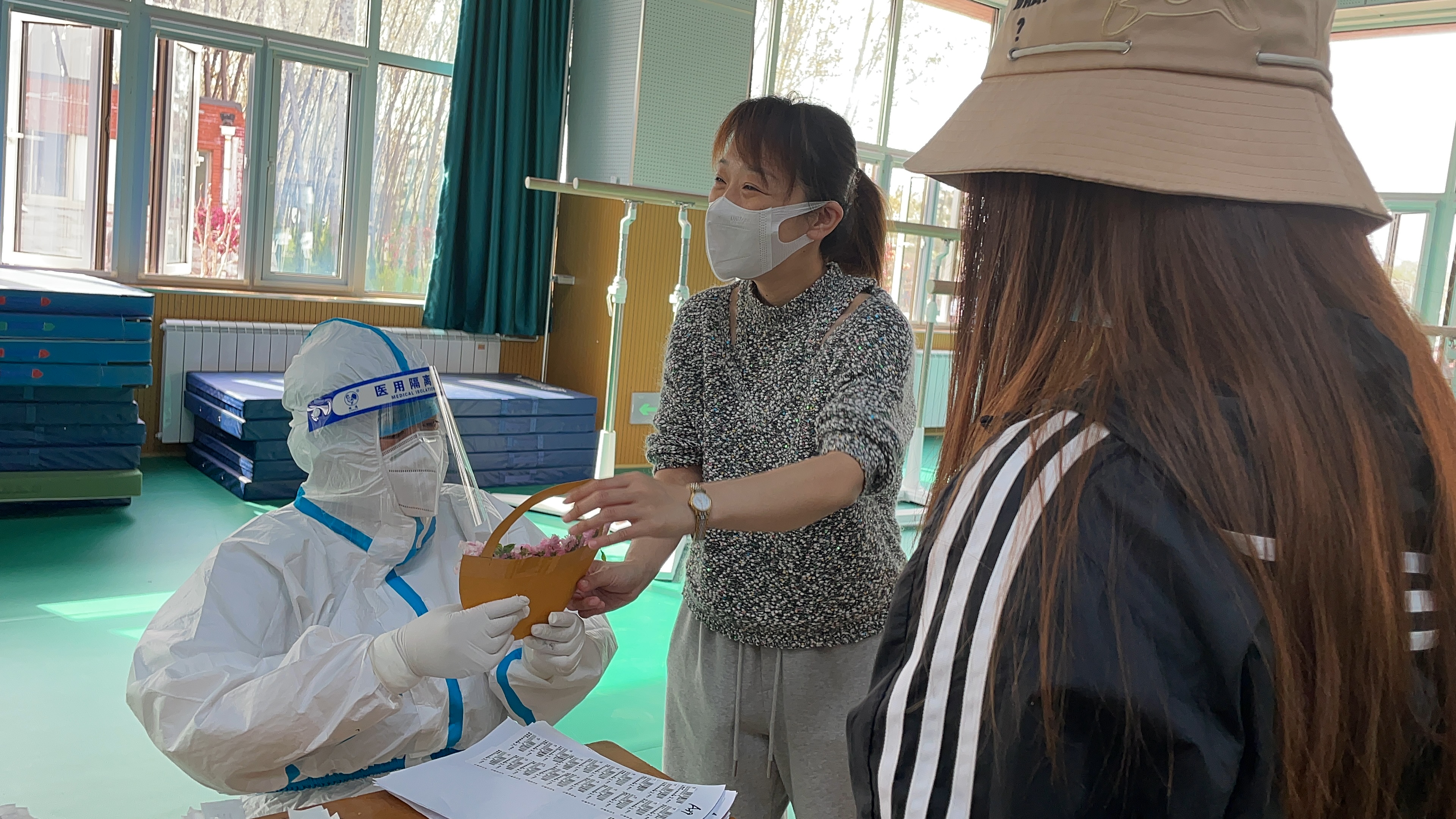 员工们把彩色卡纸裁剪成花篮的模样,然后在校园中寻觅好看的花朵,用胶带和双面胶将各色鲜艳的花朵固定在小花篮上。员工和老师做完核酸检测后并没有着急离开,而是为公司“大白”献上自己精心制作的花篮,并对他们表示了感激,“大白”也因此露出了灿烂的笑容。疫情爆发以来,医护工作者们坚持守护在同学们身边,保证同学们的安全,借此机会将同学们心中的感激表达出来,感谢他们的用心守护。”