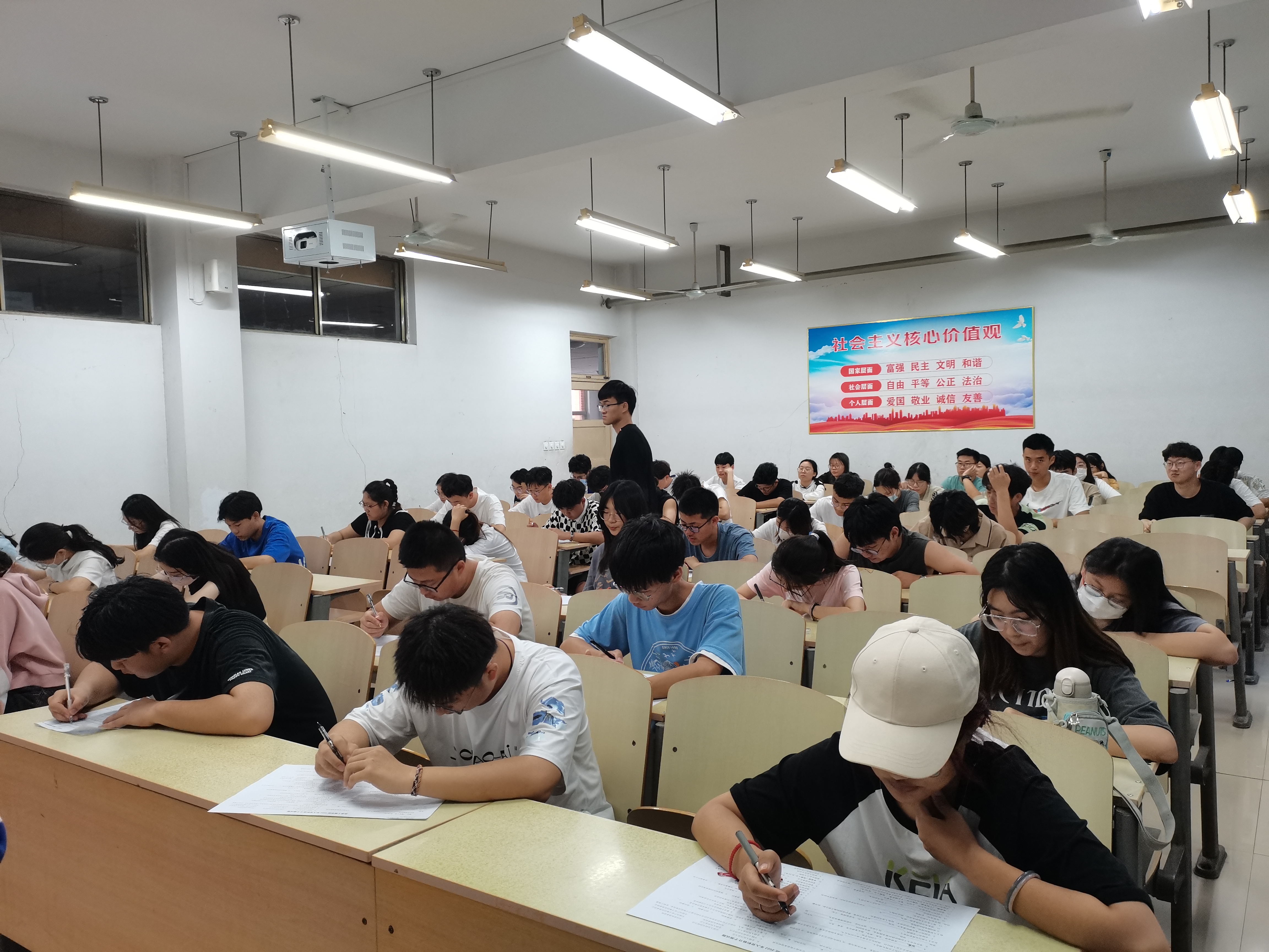 本次理论考试按照事先培训方案与计划组织安排。采取闭卷方式,共分为填空题、选择题、简答题、论述题四个部分,主要以新时代老员工入党教材和《党章》为主线,围绕党的基本理论知识展开,分别就党的宗旨、指导思想等方面对入党积极分子近期参加培训班的学习认识与收获进行重点考查。考试期间各入党积极分子严格遵守考试纪律,认真答题,员工会及自律督导中心负责人认真监考,巡视各个考场,考场纪律井然有序。