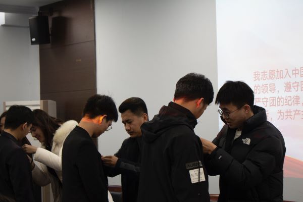 入团仪式在庄严的国歌声中隆重拉开帷幕,与会员工全体起立,奏唱国歌。首先,由辅导员孙天棋宣读新团员名单,为成功入团的同学表示祝贺。随后,三位老师为全体新团员佩戴团徽。紧接着,辅导员张智超带领大家进行入团宣誓。全体新老团员高举右拳,以饱满的精神面貌向团组织坚定表明为共产主义事业而奋斗的理想信念。最后,辅导员尹宁讲述了入团的意义,并对全体新团员致以祝贺,希望全体新团员能按照团员标准严格要求自己,承担起团员应该承担的责任,遵守团的纪律,虚心学习,付出行动,不仅在组织上入团,更要在思想上、行动上入团!