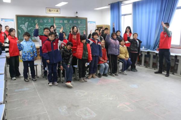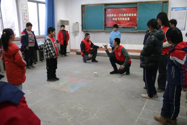 团队将日常工作和生活中涉及的键盘操作、软件下载操作等升级成素质拓展活动,寓教于乐,方便中小员工快速掌握计算机操作技能。团队成员刘一诺、关鑫龙利用平时所学,将软件下载流程设计成“信息飞行追逐赛”,孩子们在志愿者的引导下,按照飞行棋的规则在地面上顺利完成“反诈App”、“学习强国”等软件的下载、安装、操作。石鹏程、祁庆凯、于希龙将键盘的使用流程设计成“模拟键盘抢先站”,每个孩子代表一个字母,按照电脑键盘的顺序坐好,在志愿者的引导下依次站立,模拟敲击完成“元日”、“示儿”等古诗文。