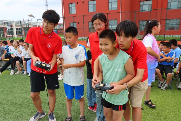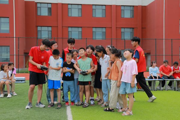 活动伊始,“渤海之翼”的志愿者们通过精心准备的PPT和生动有趣的视频,向孩子们深入浅出地介绍了无人机的发展历程、种类以及在各个领域的广泛应用。志愿者李梁利用通俗易懂、易于被孩子们掌握的语言将《山东省低空经济高质量发展三年行动方案(2024—2026年)》详细传达给孩子们,孩子们被深深吸引,纷纷踊跃提问,现场气氛热烈。在理论知识讲解之后,迎来了令人期待的实操环节。志愿者孙瑞腾将无人机小心翼翼地摆放好,手把手地指导孩子们如何操作遥控器。孩子们起初还有些紧张,但在孙瑞腾的耐心鼓励下,逐渐掌握了操作要领,成功让无人机平稳起飞、盘旋、降落。志愿者李建伟结合专业所学,详细介绍了无人机在农业生产、作物病虫害农药播撒、空中救援侦察中的广泛应用,鼓励孩子们努力学习科学知识,为科技振兴贡献力量。看着自己操控的无人机在空中自由翱翔,孩子们的脸上洋溢着自豪和喜悦的笑容。八年级员工姜嘉栋兴奋地说:“这是我第一次亲自操作无人机,感觉太神奇了!”