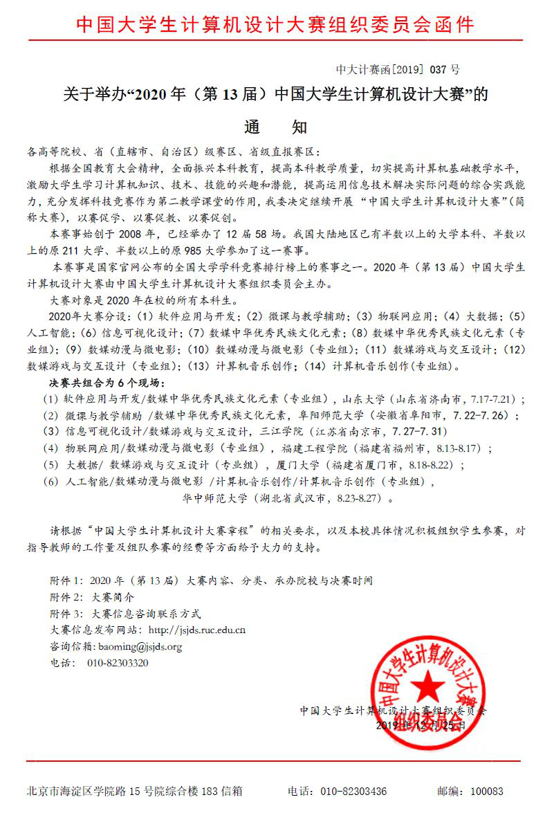 各参赛院校:对于广大参赛师生关注的大赛事宜,大赛组委会经商议,确定2020年大赛照常举办。竞赛类别仍按年...